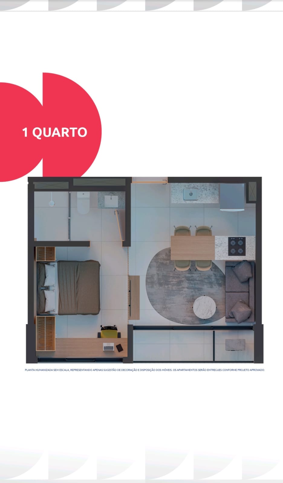– 04 apartamentos de 1 quarto + terraço descoberto: 51,73 m² e 56,44 m²