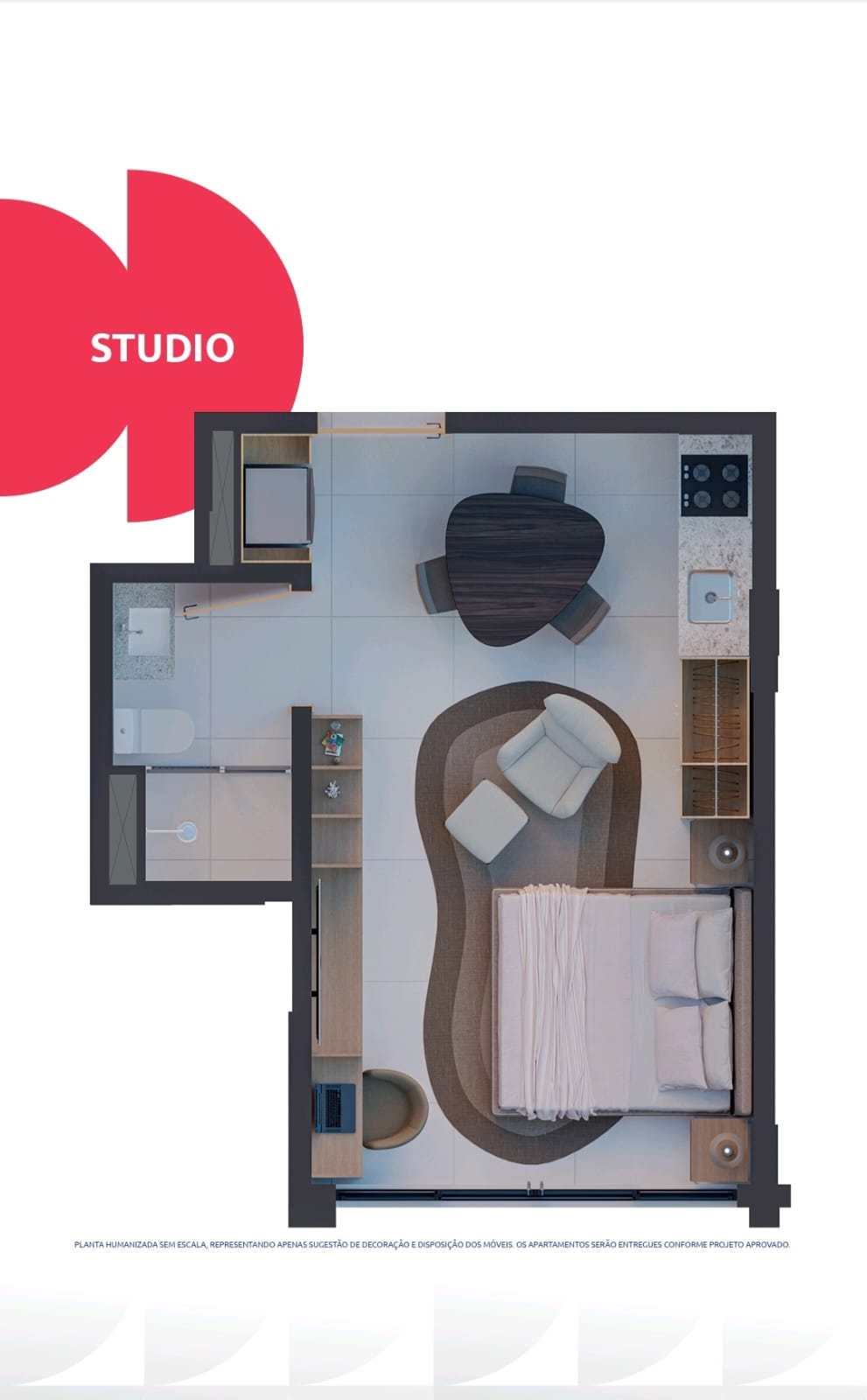 – 04 apartamentos de 1 quarto + terraço descoberto: 51,73 m² e 56,44 m²